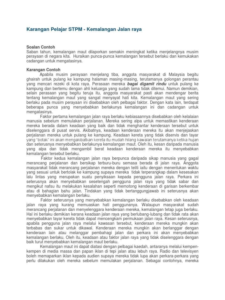 Kemalangan jalan raya yang berlaku telah menyebabkan kecederaan, kematian serta kerosakan kenderaan yang terbabit. Pelajar ini boleh mengambil peperiksaan awam seperti pmr spm stpm dan sijil kemahiran malaysia. Dasawarsa ini, isu kemalangan jalan raya yang semakin meruncing sering. Hal ini demikian, pemandu akan dapat mengawal diri dan kenderaan mereka dengan sempurna dalam usaha mengelakkan kemalangan. Langkah mengatasi kemalangan jalan raya stpm. Bagi mengatasi masalah ini, pihak polis trafik telah mengadakan pelbagai usaha bagi mengurangkan lagi kadar kemalangan jalan raya. Sebenarnya pelbagai program telah dilaksanakan oleh pihak kerajaan dalam usaha untuk mengurangkan kadar kemalangan jalan raya khususnya pada musim perayaan. Langkah utama dalam mengurangkan angka kemalangan jalan raya sudah pastilah dengan mendidik para pemandu khususnya pemandu pengangkutan awam . Pengguna jalan raya juga disarankan .
